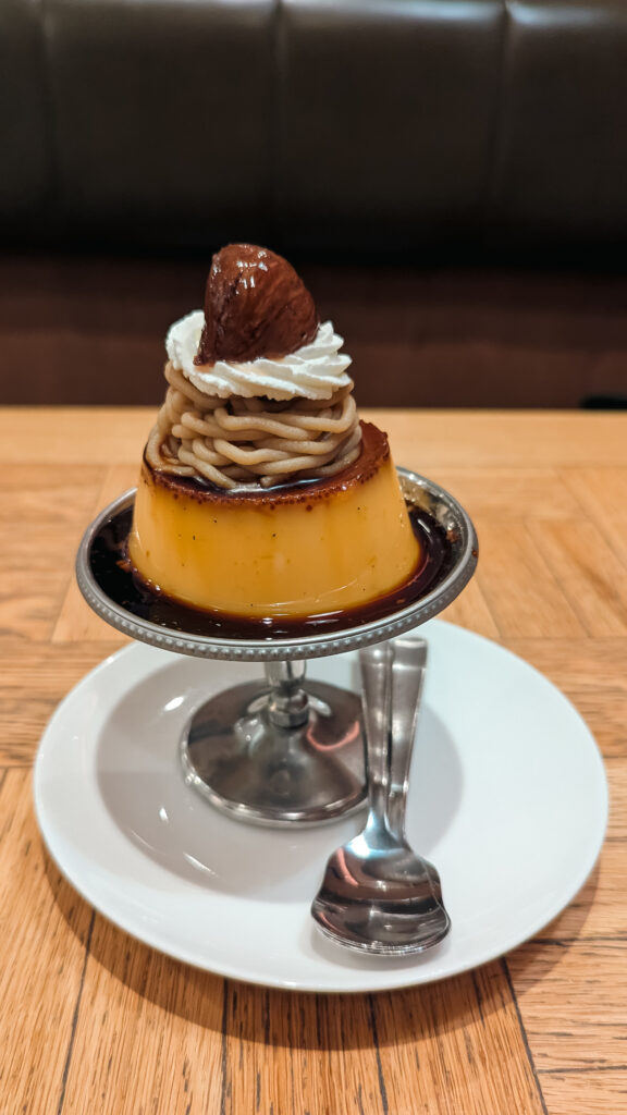 February Cafe, Tokio – Japoński deser purin (プリン) – odpowiednik crème caramel lub flanu, czyli budyń karmelowy z warstwą płynnego karmelu na spodzie. Tutaj podano go w bardzo popularnej w Tokio wersji „kissa-ten style” (z kawiarni retro), czyli na górze znajduje się śmietanka, krem kasztanowy Mont Blanc (charakterystyczne nitki z purée z kasztanów), a całość wieńczy kandyzowany kasztan (kuri). To połączenie klasycznego japońskiego purin i francuskiego Mont Blanc, które jest teraz bardzo modne w tokijskich kawiarniach.